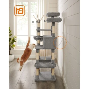 ALL-IN-ONE VERGNÜGUNGSPARK: Nickerchen machen, entspannen, dehnen, spielen… Dieser Kletterbaum bietet zahlreiche VIP-Services. Er verfügt über 2 große Plattformen, 1 Katzenhaus, 1 Hängematte, 1 Liegemulde, 3 Stäbe mit Fellbällchen und 1 Sisalseil