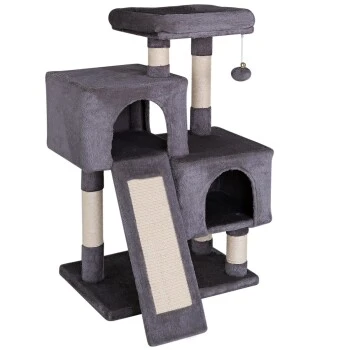 Mit diesem Katzenspielhaus aus weichem Plüsch bleiben keine Wünsche Ihrer Samtpfote offen. Die kuscheligen Höhlen laden zum Ausruhen und Verstecken ein und der hängende Plüschball sorgt für den nötigen Spielspaß. Das einladende Liegebett ist ideal für die Ruhezeiten und das Beobachten der Umgebung. Die Stämme und die Rampe mit robustem Sisal unterstützen die Krallenpflege und halten Ihre Katze somit von den Möbeln fern.