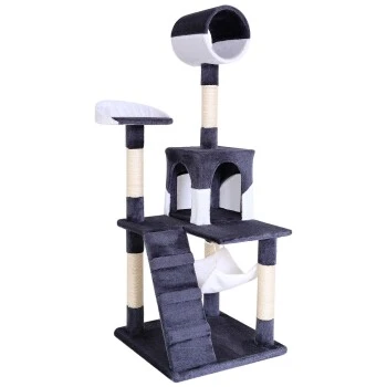 Mit diesem Katzenspielhaus mit weichem Plüsch und viel Sisal bleiben keine Wünsche Ihrer Samtpfote offen. Die kuschelige Höhle und das gemütliche Liegeplateau sind ideal für die Ruhephasen und das Beobachten der Umgebung geeignet. Die Röhre und eine Treppe sorgen für den nötigen Spiel- und Kletterspaß. Die Stämme mit robustem Sisal unterstützen die Krallenpflege und halten Ihre Katze somit von den Möbeln fern.